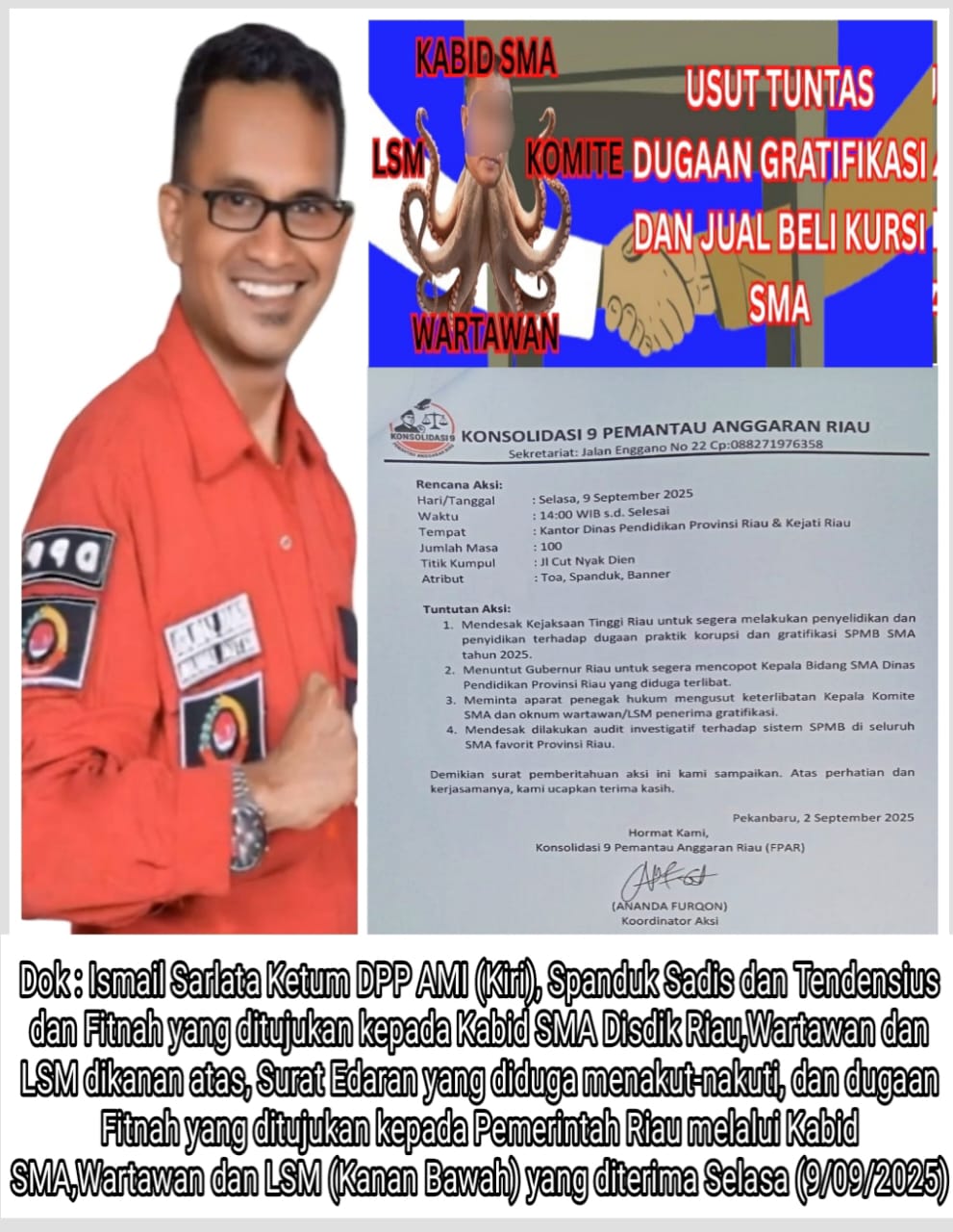 ” Sungguh amat disayangkan dan kita sesalkan atas sikap seorang oknum yang diduga bernama Ananda Furqon, akan melakukan aksi di Dinas Pendidikan dengan dugaan menyebarkan surat edaran tertanggal 9 September 2025, tanpa stempel dan spanduk aksi atas nama Konsilidasi 9 Pemantau Anggaran Riau yang terkesan menakuti-nakuti dan fitnah yang ditujukan kepada profesi Wartawan dan LSM dengan memberikan 4 tuntutan kepada Gubernur Riau dan Penegak Hukum.” ucap Ismail Sarlata dalam pres rilisnya kepada Media, Rabu (10/09/2025).
