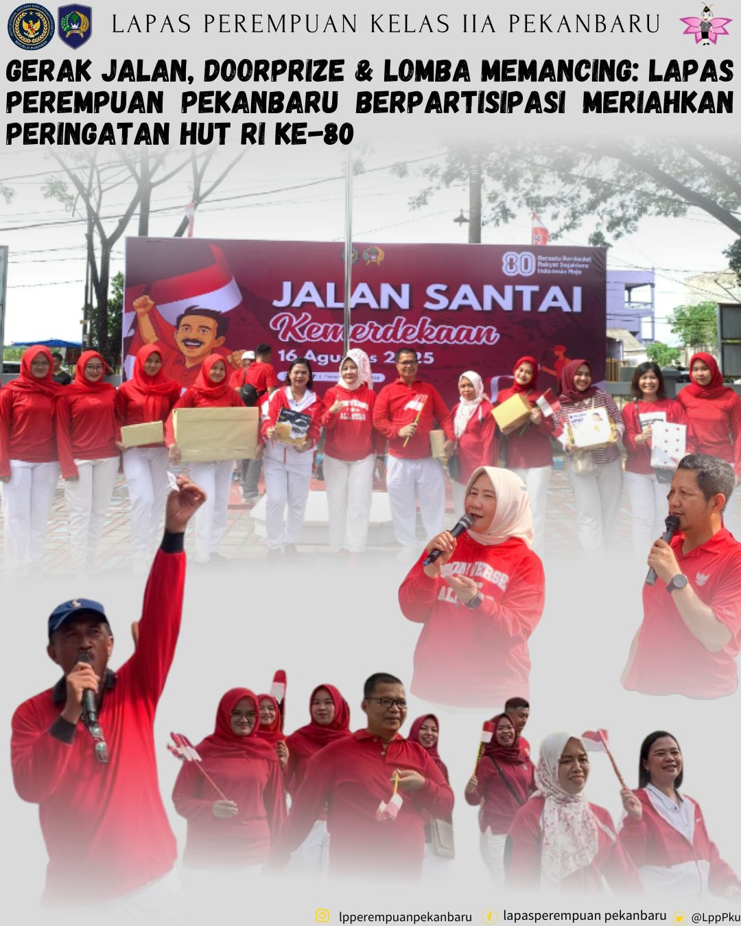 Pekanbaru – Dalam rangka menyemarakkan Hari Ulang Tahun ke-80 Kemerdekaan Republik Indonesia, Lapas Perempuan Kelas IIA Pekanbaru turut berpartisipasi dalam kegiatan Gerak Jalan Santai yang diselenggarakan oleh Kantor Wilayah Direktorat Jenderal Pemayarakatan Riau, bertempat di Rutan Kelas I Pekanbaru, Sabtu (16/8/2025).
