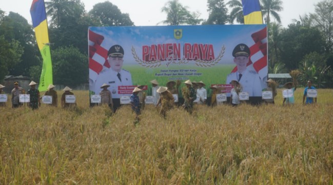 Selain komoditas hortikultura, sektor tanaman pangan terutama komoditas padi menunjukkan perkembangan yang positif. Hal ini ditegaskan melalui kegiatan Panen Raya Padi pada 8 Mei 2025 di Desa Sibanteng Kecamatan Leuwisadeng, yang menjadi bagian dari rencana aksi 100 Hari Kerja Bupati dan Wakil Bupati Bogor. Bupati dan Wakil Bupati turun langsung memanen padi varietas Inpari 32 dan Inpari 48 di lahan seluas 50 hektar yang digarap oleh dua kelompok tani. Produktivitas rata-rata mencapai 8,26 ton per hektar, angka yang menunjukkan peningkatan signifikan dibanding musim sebelumnya. Dalam sambutannya, Bupati Bogor Rudy Susmanto menekankan bahwa perlindungan terhadap petani, penyediaan sarana produksi, kepastian tata ruang, serta pendampingan penyuluh merupakan pondasi penting menjaga keberlanjutan sektor pertanian. Adapun kegiatan panen raya padi ditunjukkan pada gambar 2.