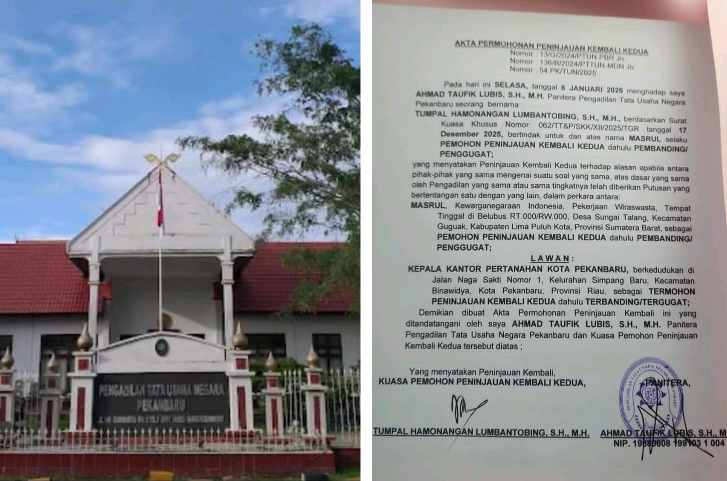 Itu artinya, pada proses hukum Tingkat Pertama yaitu Pengadilan Tata Usaha Negara Pekanbaru pada tanggal 6 Januari 2026 dan Memori Peninjauan Kembali Kedua serta Lampiran telah diterima dan akan diproses, ungkap Tumpal.